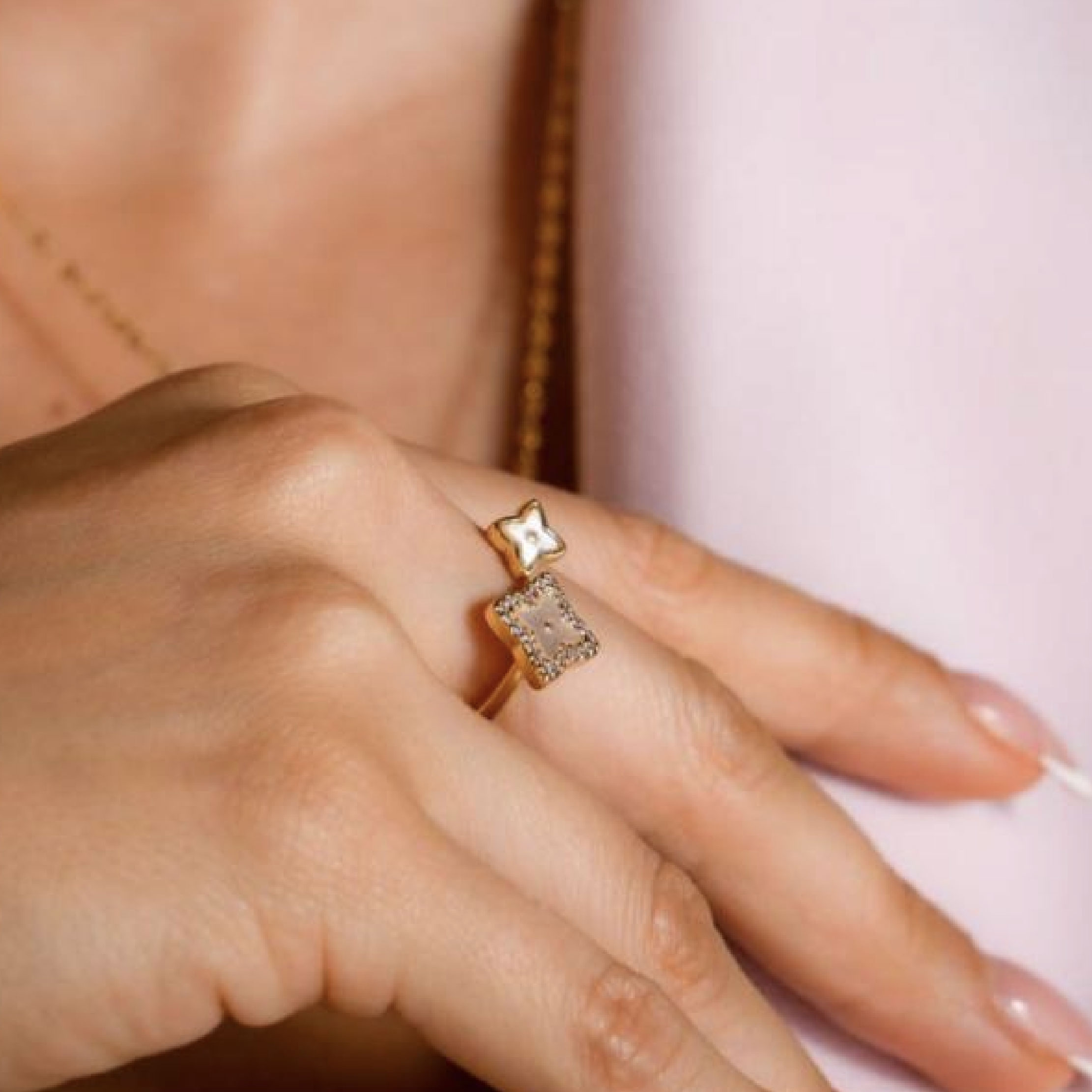 An elegant 18K laminated gold clover ring featuring a refined open design with delicate clover accents and subtle zircon details. Its modern yet timeless style makes it a versatile piece, perfect for everyday wear or for adding a sophisticated touch to special occasions.