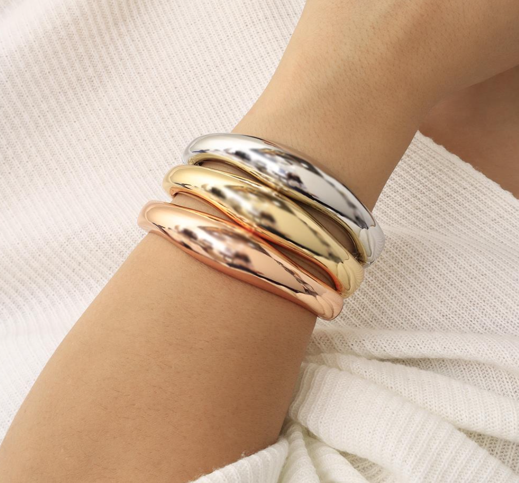A modern, eye-catching bracelet featuring a trio of metallic tones—silver, gold, and rose gold—in a bold, polished design. Its rhodium finish ensures long-lasting shine and durability, while its minimalist structure adds instant sophistication. Perfect for elevating everyday outfits or enhancing formal looks with a contemporary touch.